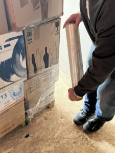Bei rund 2 m Höhe wurde im Anschluss die Palette mit den Kartons manuell foliert, so dass die Palette stabil steht.